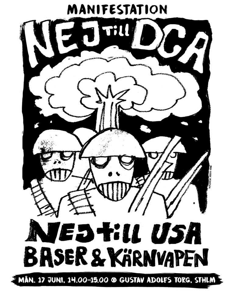 Hälsar välkommen – arrangörer är Arbetsgruppen mot DCA/Nätverket Nej till Nato. Med oss idag också Stockholms fredsförening och Folkomröstningskampanjen