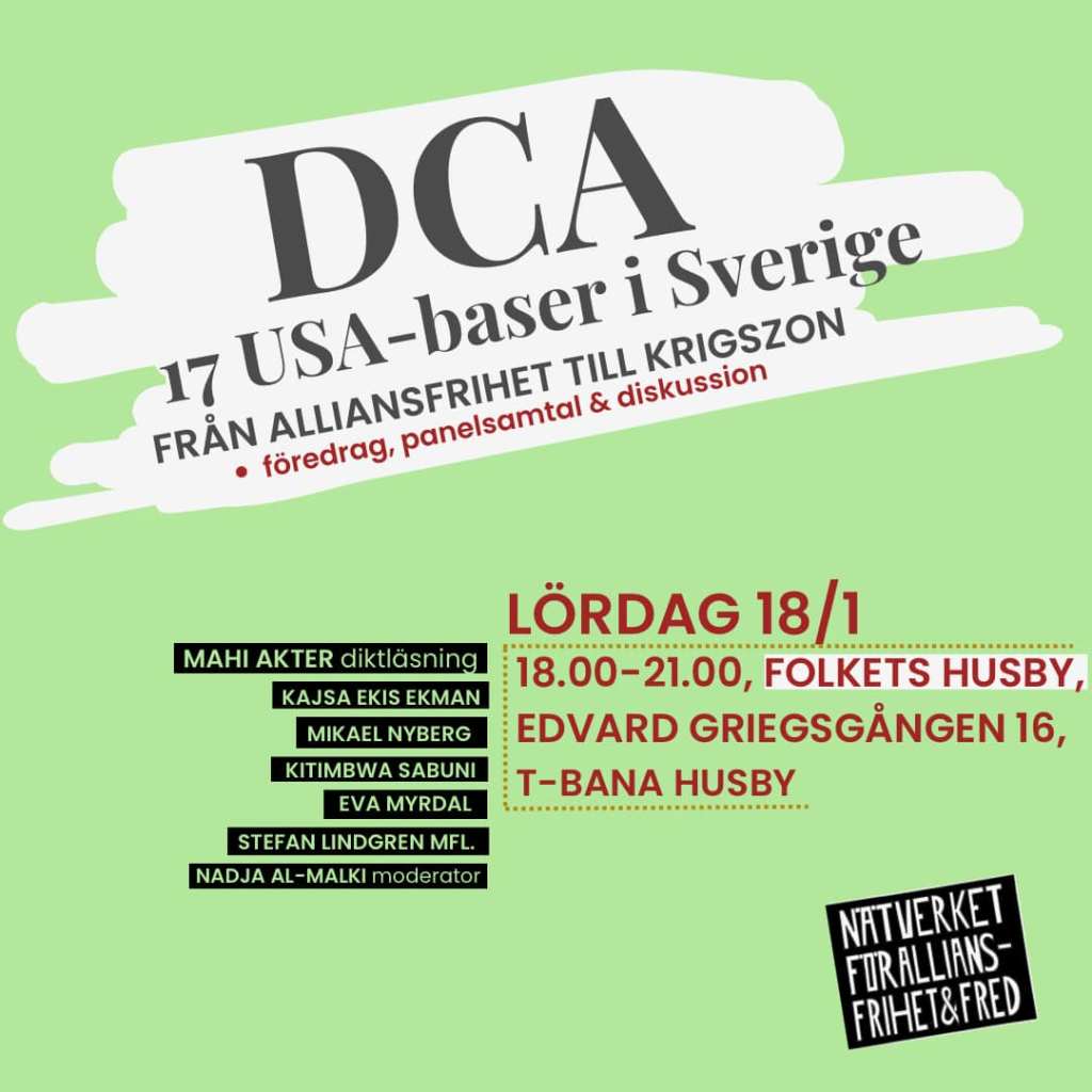 - Event ”DCA- 17 USA-BASER I SVERIGE – från alliansfrihet till krigszon!” Föredrag, panelsamtal och diskussion med bla. Mikael Nyberg, Kitimbwa Sabuni, Kajsa Ekis Ekman, Eva Myrdal mfl. Lördagen den 18/1 kl. 18.00-21.00 Folkets Husby